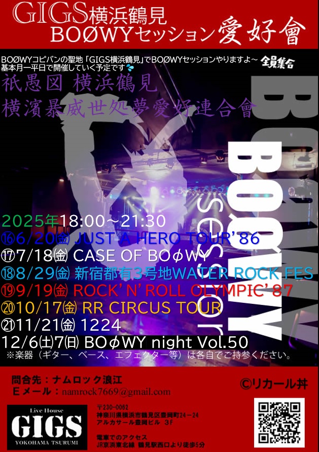 | 令和 7年 1月17日(金) | 2025 | KGIGS横浜鶴見 BOφWYセッション 【横濱暴威世処夢愛好連合會】(**名) |